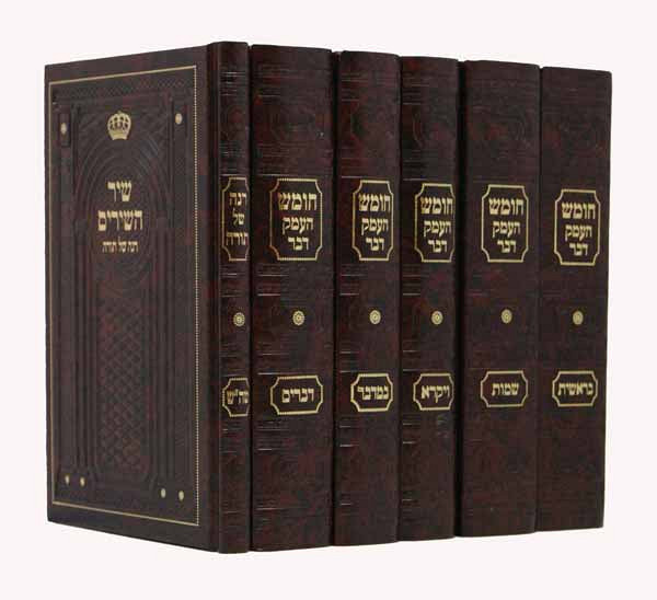 חומש העמק דבר בכריכת לוקס. נוסף לו כרך "רנה של תורה" כולל ב' פירושים על שיר השירים מהנצי"ב.